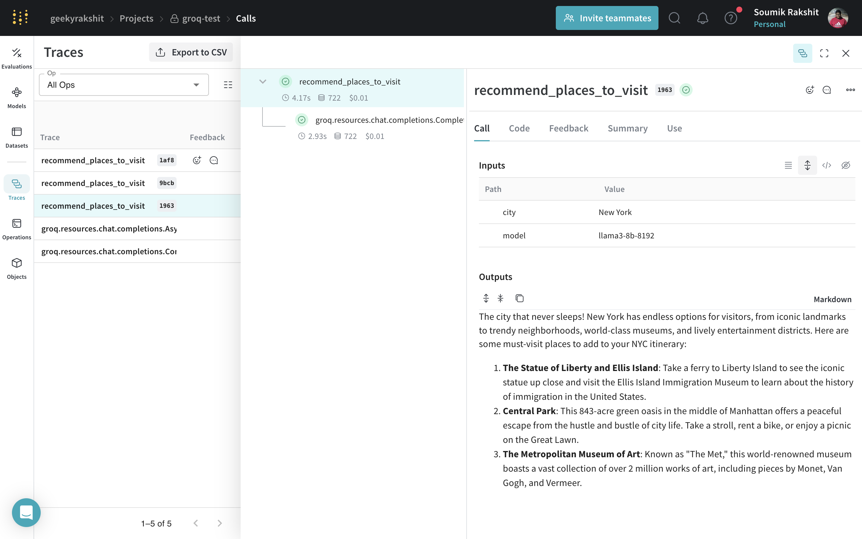 以下の例では、 recommend_places_to_visit という関数があります。これは、都市の観光スポットを推薦する @weave.op でラップされた関数です。